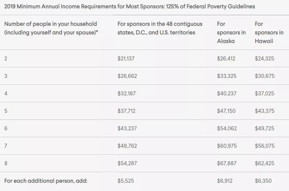 国会从1996年起要求申请绿卡的人提交“经济担保书”,也就是I-864表格——如果你申请婚姻绿卡,担保书由配偶提供,如果你申请雇佣绿卡,则由雇主提供。按照2019年的标准,假如你替配偶申请绿卡,没有孩子,那么一家人的最低收入要求是联邦贫困县的125%,即21137元。